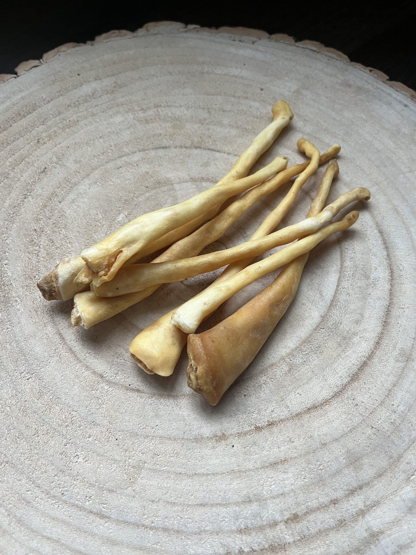 Doordat deze lamsstaarten gedroogd zijn met de huid, zijn ze net iets harder dan de gewone lamsstaarten.
