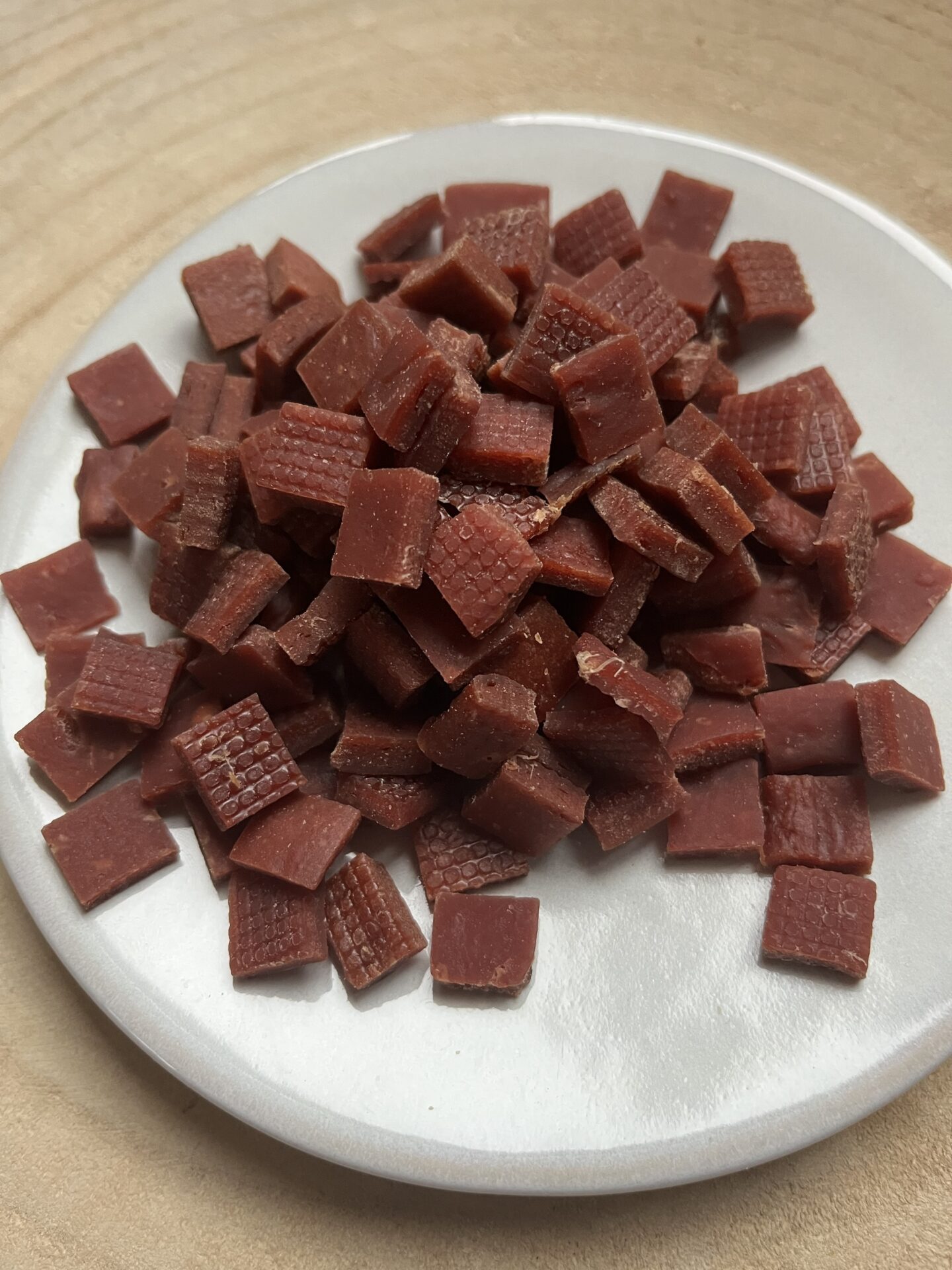 De trainers kruimelen niet in je zak en hebben weinig geur. De vleestrainers worden verpakt in een hersluitbare verpakking.